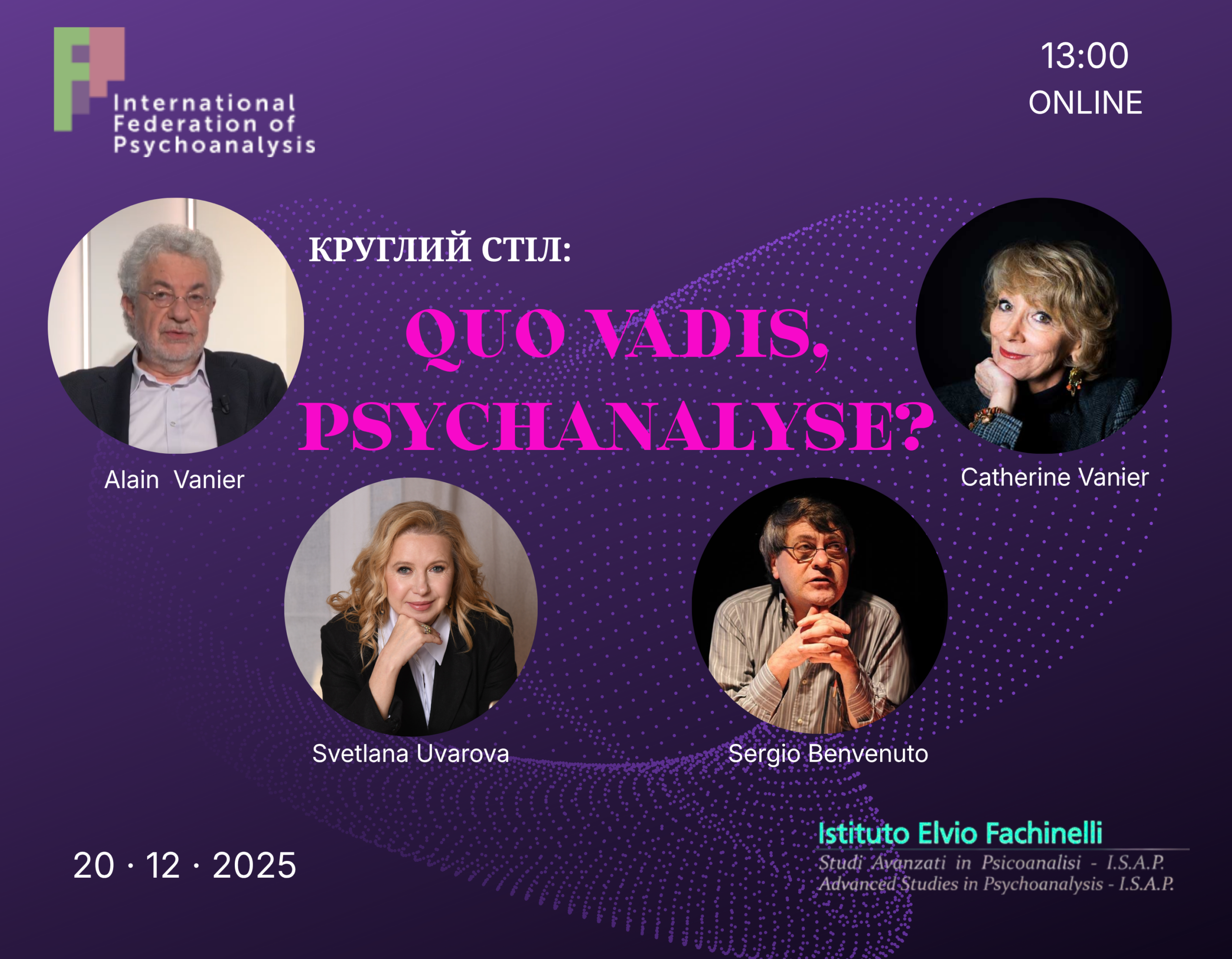 Світлана Геннадіївна Уварова – HDR (Франція), Ph.D. (Україна), засновниця й ректорка Міжнародного інституту глибинної психології (Київ, Україна), президентка Української асоціації психоаналізу (Київ, Україна), членкиня Правління, сертифікована тренінгова аналітикиня і супервізорка Європейської конфедерації психоаналітичних психотерапій (Відень, Австрія), членкиня Світової Ради з психотерапії (Відень, Австрія), президентка Міжнародної федерації психоаналізу (Страсбург, Франція), головна редакторка видавництва ПВНЗ «МІГП», головна редакторка журналу «Психоаналіз. Часопис» (Київ, Україна), членкиня редакційної ради журналу «European Journal of Psychoanalysis» (Нью-Йорк, США) і головна редакторка його версії для країн Східної Європи, наукова редакторка та укладачка «Енциклопедичного словника з психоаналізу та психології» (2024), авторка книг «Любов і смерть у психоаналізі» (2015), «Психоаналіз & соціальні процеси» (2017), а також численних публікацій з питань психоаналізу.