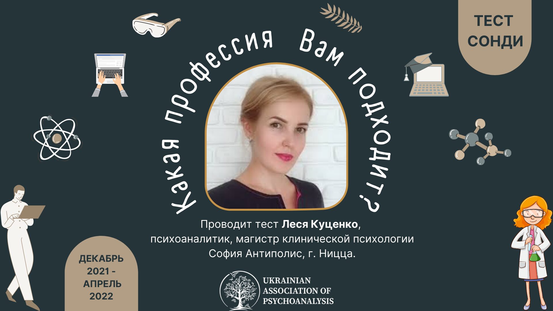 Проводит тест Куценко Леся Петровна, психоаналитик, магистр клинической психологии университета София Антиполис, г. Ницца, преподаватель Международного Института Глубинной Психологии, читает курсы “Психоаналитические концепции нарциссизма” и “Психоаналитическая диагностика”.