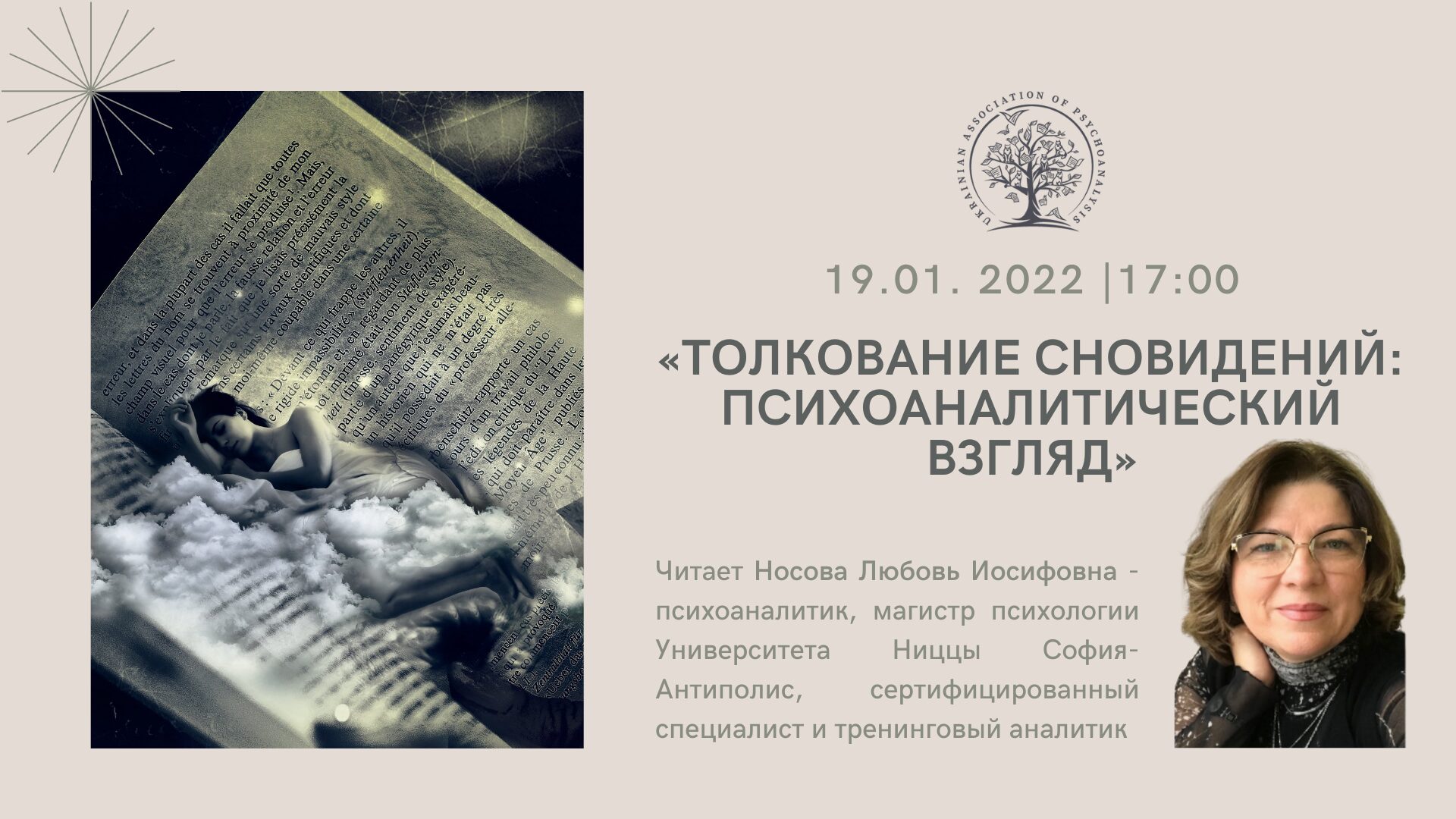 Приглашаем Вас на лекцию психоаналитика Носовой Любовь Иосифовны «ТОЛКОВАНИЕ СНОВИДЕНИЙ: ПСИХОАНАЛИТИЧЕСКИЙ ВЗГЛЯД».